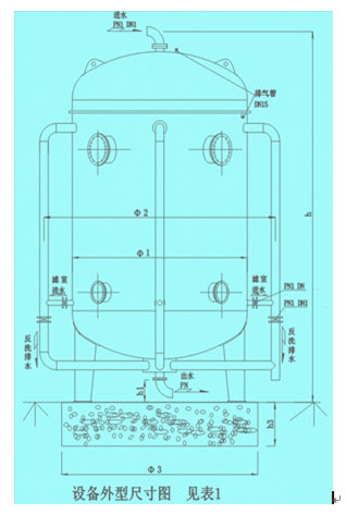 濾層厚度:1.0-1.2m; 進口壓力≧0.06Mpa; 設(shè)備承受壓力:0.06-0.3Mpa、0.3-0.6Mpa、0.6-1.0Mpa。